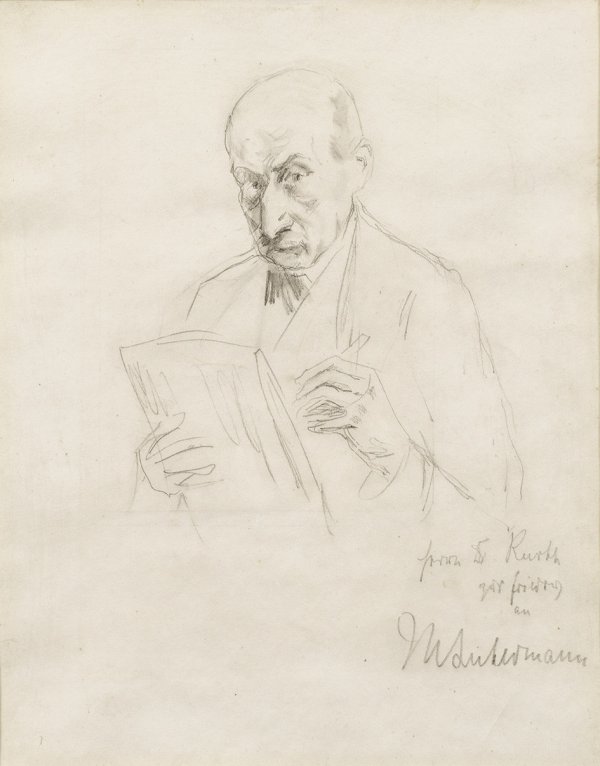 Dargestellt hat sich Liebermann in dieser künstlerisch grandiosen Zeichnung wie häufig als Grandseigneur im Anzug, den Kopf mit seiner markanten Nase ins Halbprofil gewandt und leicht gesenkt. Mit überaus kritischem Blick schaut er dem Betrachter entgegen, zugleich sich selbst bespiegelnd bzw. reflektierend. Die Zeichnung lässt sich durch einen Vergleich mit mehreren Druckgrafiken sehr wahrscheinlich auf den Zeitraum 1912-1923 datieren (Wolfgang Werner gibt 1923 an). Hierzu zählen eine Lithographie von 1912 (Schiefler 133) und eine Radierung von 1923 (Achenbach 56), die ihn spiegelbildlich in fast identischer Pose zeigen. Wie kaum ein anderer Künstler nach Rembrandt hat sich der Impressionist Max Liebermann fast während seines gesamten Lebens, besonders ab 1902, so häufig in Gemälden, Zeichnungen und Druckgrafiken selbst geschildert und eindringlich charakterisiert, mit Vorliebe malend an der Staffelei oder zeichnend. Bleistift/Papier. R. u. sign. mit Widmung "Herrn Dr. Kurth zur Erinnerung an MLiebermann". Blatt 29,7 cm x 23,2 cm. Rahmen.