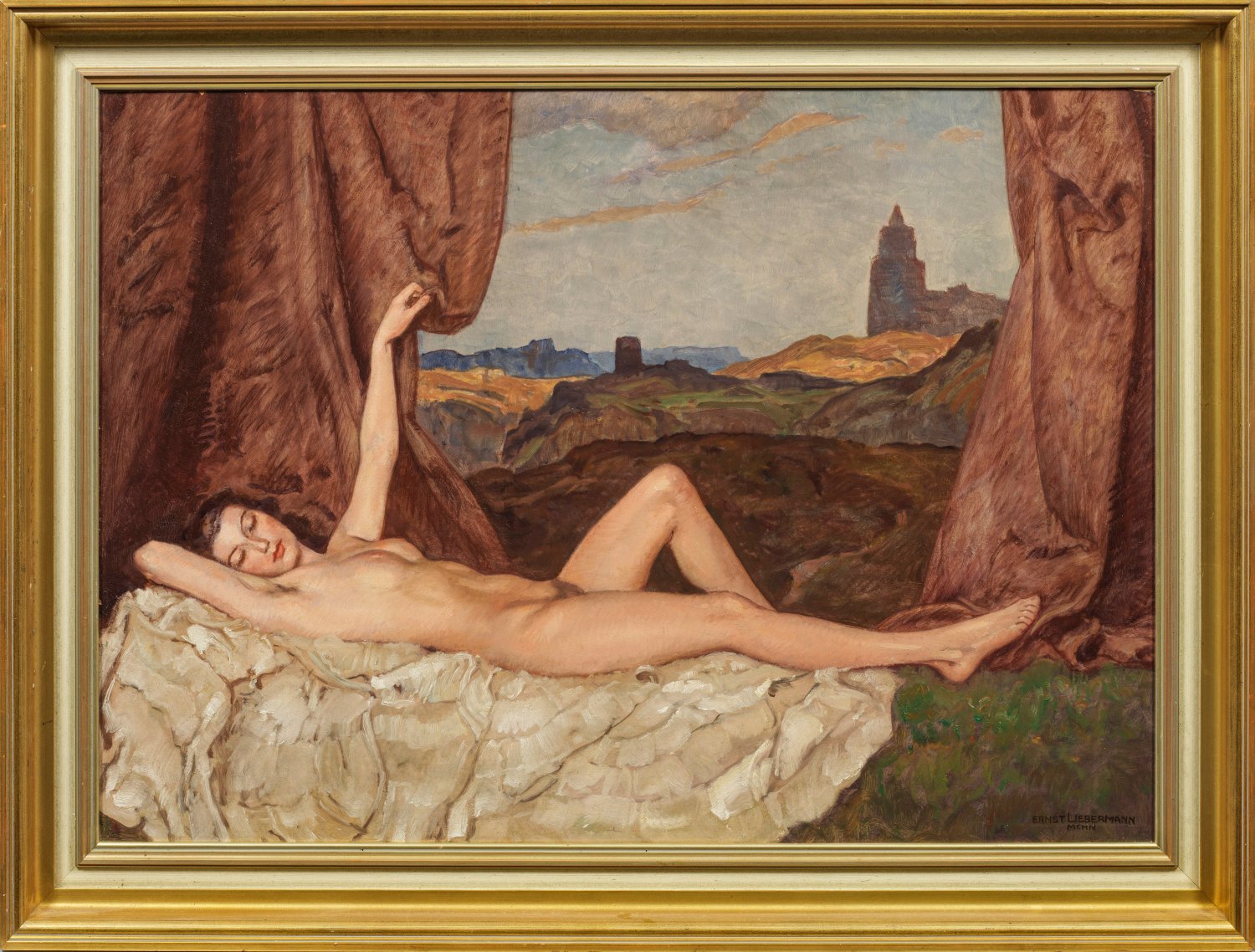 In pastelltonigen, warmen Tönen und mit weicher Lichtführung gestaltetes Werk des Künstlers, der ab 1897 in München ansässig war und seine impressionistischen Bilder auf vielen bedeutenden Ausstellungen präsentierte. Besonders großen Anklang fanden seine traumverloren wirkenden Aktbilder, wie dieses für ihn typische Gemälde. Öl/Masonitplatte. R. u. sign. mit Ortsangabe München. 70 cm x 99,5 cm. Rahmen.