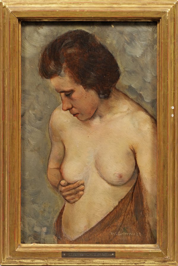 In erdigem Kolorit und weichem, lasierenden Duktus gemaltes Bildnis Schmurrs, der an der Düsseldorfer Akademie bei Peter Janssen, Arthur Kampf und Eduard von Gebhardt studierte und Meisterschüler bei Claus-Meyer war. Er war Mitbegründer des Sonderbundes in Düsseldorf und Mitglied im Kunstverband Düsseldorf sowie in der Künstlerveieinigung Malkasten. Inspiration für seine Arbeit suchte er sich bei den Präraffaeliten, den Symbolisten und den Realisten. Öl/Mahagoniplatte. R. u. sign. 34 cm x 21,5 cm. Rahmen.