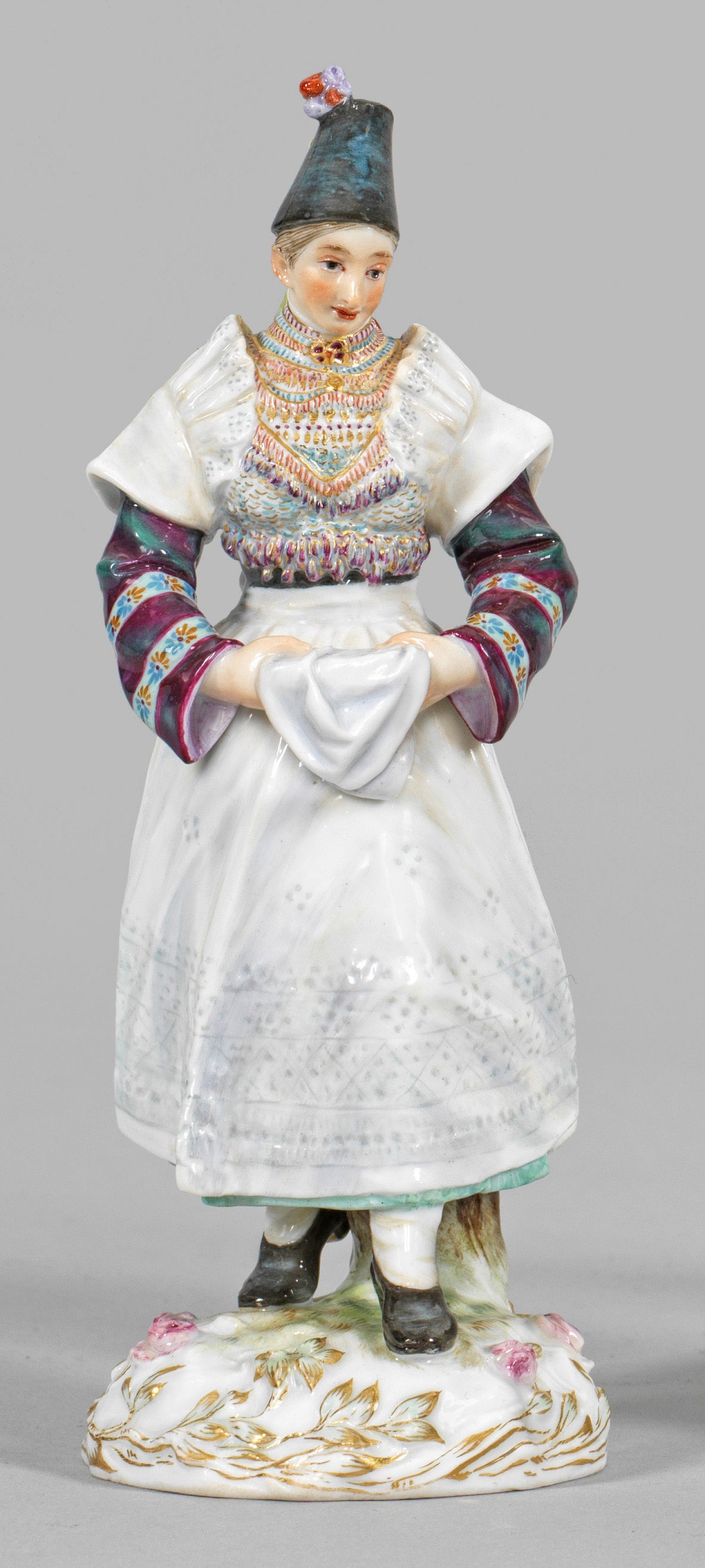 Aus einer Reihe von 25 Trachtenfiguren des Bildhauers Hugo Spielers, dessen Modelle die Meissener Manufaktur zwischen 1897 und 1898 erwarb. Spieler studierte an der Akademie und Kunstgewerbeschule in München und wurde als Professor an die Dresdner Kunstgewerbeschule berufen.