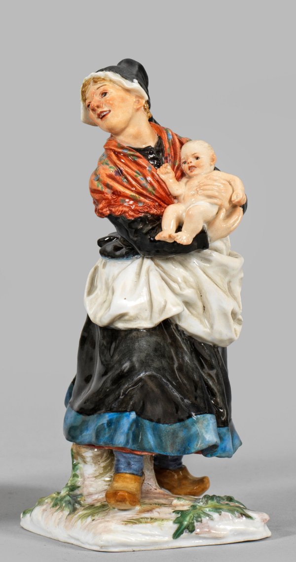 Auf quadratischem, naturalistisch gestaltetem Sockel stehende Frau in traditioneller Mönchsguter Volkstracht aus Rügen, in den Armen einen Säugling haltend. Polychrome Malerei. Entw. Hugo Spieler, um 1897 - 1898. Modell-Nr. Q 190 q. Minim. rest.; Schwertermarke. H. 16 cm.