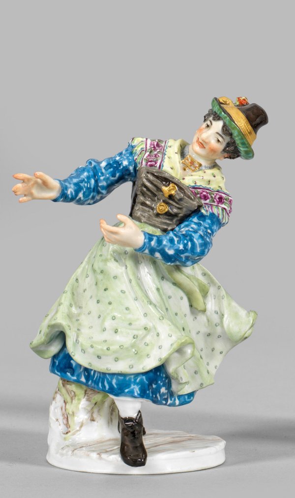 Aus einer Reihe von 25 Trachtenfiguren des Bildhauers Hugo Spielers, dessen Modelle die Meissener Manufaktur zwischen 1897 und 1898 erwarb. Spieler studierte an der Akademie und Kunstgewerbeschule in München und wurde als Professor an die Dresdner Kunstgewerbeschule berufen.