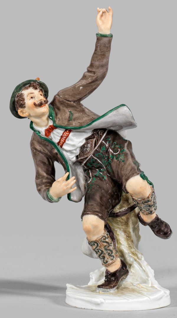 Auf flachem Rundsockel mit Holzdielenoptik, in ausdruckstarker, tänzerischer Pose stehender Herr in bayrischer Volkstracht beim Schuhplattlern. Polychrome Malerei. Entw. Hugo Spieler, um 1897 - 1898. Modell-Nr. Q 190 u. Minim. rest.; Schwertermarke. H. 14 cm.
