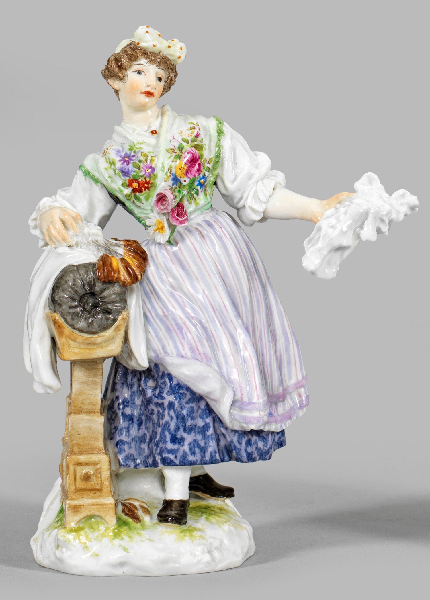 Auf naturalistischmn Rundsockel, gelehnt an einen Klöppelständer mit Kissen, Garn und Holzspulen, stehende junge Dame in Volkstracht, in der linken Hand die fertigen Spitzenkanten haltend. Polychrome Malerei. Entw. Hugo Spieler, um 1897 - 1898. Modell-Nr. Q 190 k. Minim. rest.; Schwertermarke. H. 14,5 cm.