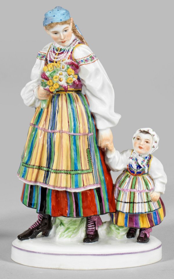 Auf ovalem Sockel stehende junge Mutter in festlicher, farbenprächtiger Volkstracht mit blauem, gepunktetem Kopftuch und reichem Schmuckbehang, in der rechten Hand einen Strauß aus Wiesenblumen tragend. An der Linken hält sie ihre Tochter an der Hand, ebenfalls in volkstümlicher Tracht gekleidet. Polychrome Malerei. Entw. Erich Hösel, 1917. Modell-Nr. V 166. Schwertermarke. H. 18 cm.