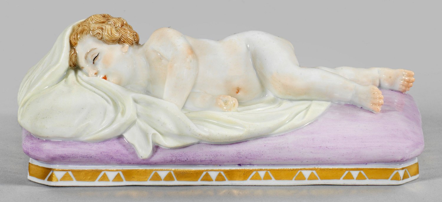Rechteckiger, an den Ecken abgeschrägter Sockel mit umlaufender Goldbordüre. Über einem gepolsterten, rosafarben staffierten Bettlager, auf einem zartgelben Laken liegendes, schlummerndes Kind. Polychrome Malerei. Modell-Nr. U 44. Schwertermarke. H. 5 cm. 14 cm x 7,5 cm.