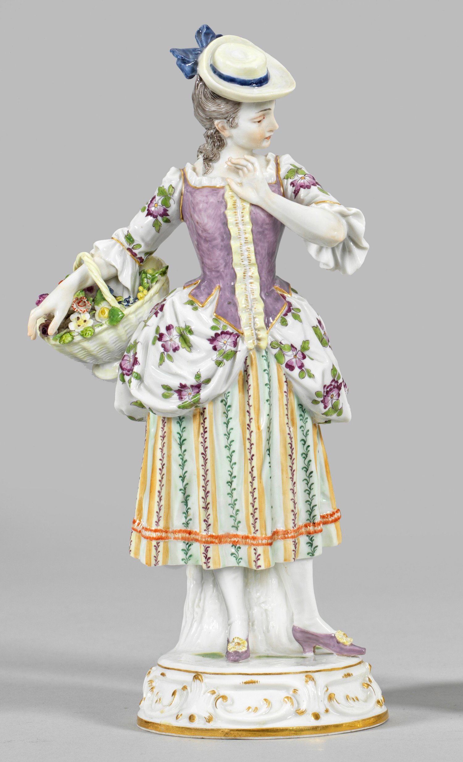 Auf rankenreliefiertem Rundsockel stehende, junge Dame in sommerlicher, gemusterter Kleidung und zartgelben Hut, einen Weidenkorb mit plastischen Blumen tragend. Polychrome Malerei mit Goldstaffage. Entw. August Herzig, 1898. Modell-Nr. R 138. Schwertermarke. H. 24,5 cm.