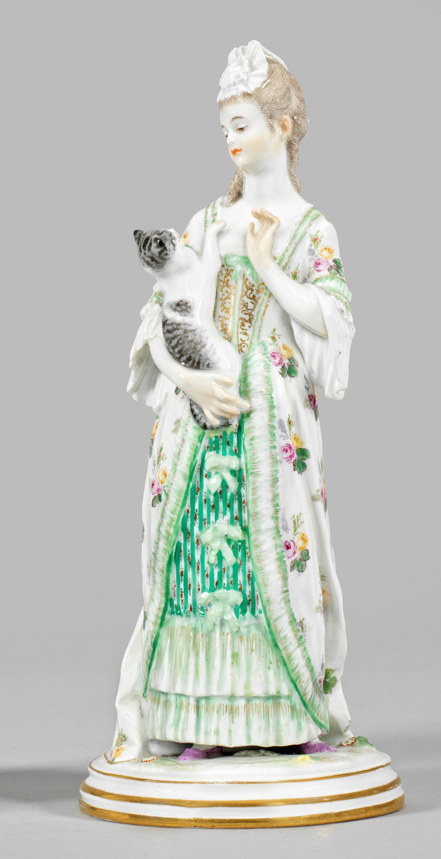 Auf profiliertem Rundsockel stehende Dame, mit einer Katze auf ihrem rechten Arm spielend. Entw. Jacob Ungerer, 1881. Modell-Nr. L 163. Polychrome Malerei mit Gold. Minim. rest.; Schwertermarke. H. 24 cm.