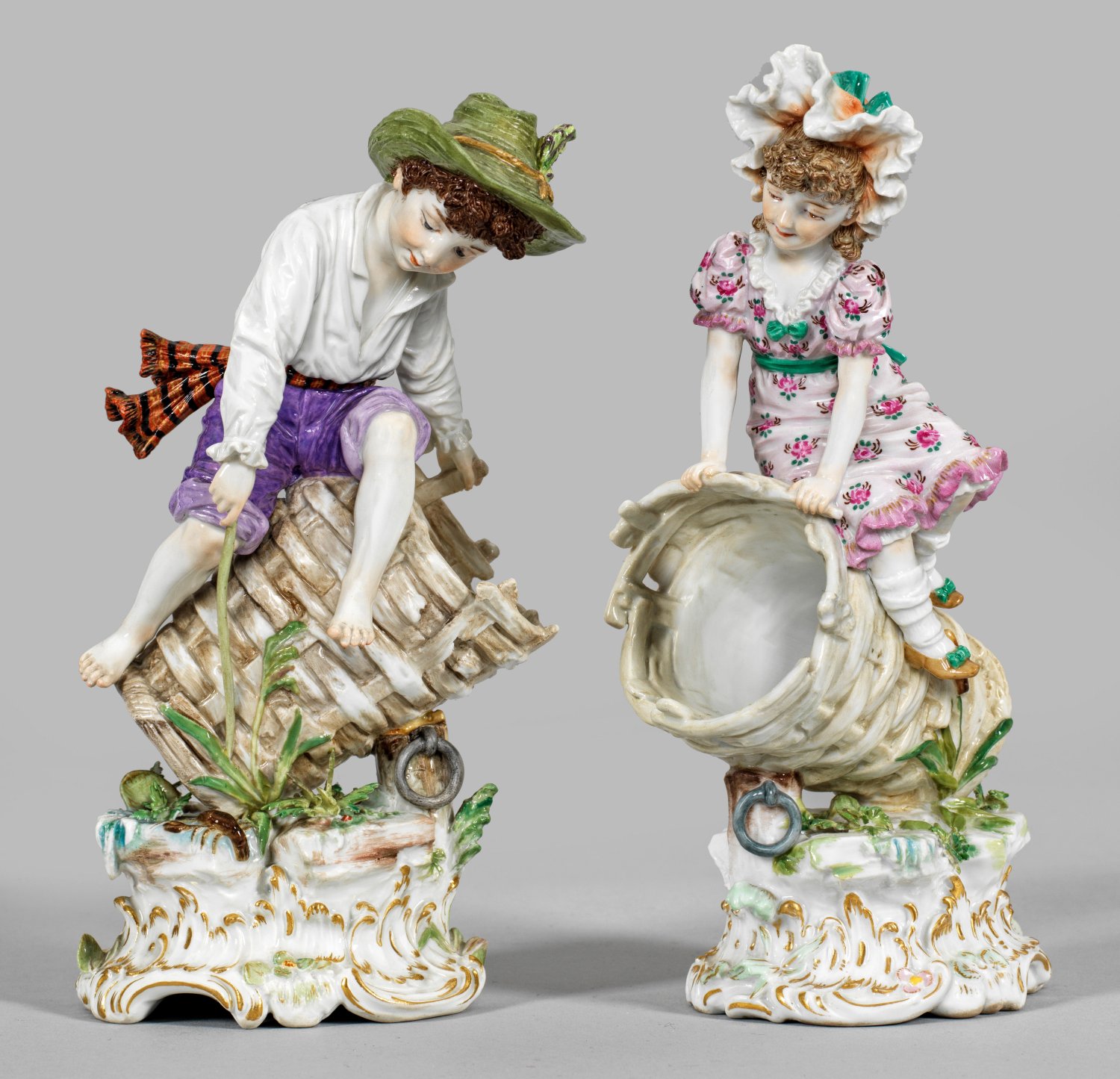 Gegenstücke. Hoher, goldstaffierter Rocaillesockel. Über felsigem Terrain mit Blattwerk stehender, schräg gestellter großer Weidenkorb. Darauf sitzender Knabe in sommerlicher Kleidung mit Hut bzw. Mädchen in rosafarbenem, geblümtem Kleid mit Spitzensaum und Spitzenhaube. Polychrome Malerei mit Goldstaffage. Entw. Alfred König, um 1895. Modell-Nr. P 195 und P 196. Minim. best./rest.; Schwertermarke. H. 20,5 cm - 21 cm.