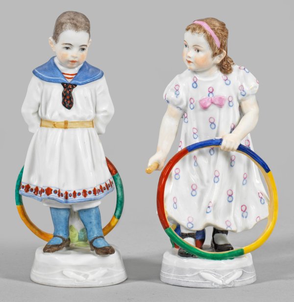 Gegenstücke. Auf vegetabil reliefiertem Rundsockel stehender Knabe im Matrosenanzug bzw. Mädchen in weißem, gemustertem Kleid, einen Spielreifen haltend. Das Mädchen zudem mit dem zum Reifentreiben gehörendem Stock. Polychrome Malerei. Entw. Alfred König, um 1900-1910. Modell-Nr. X 101 und X 102. Unw. rest.; Schwertermarke. H. 12,5 cm - 13 cm.