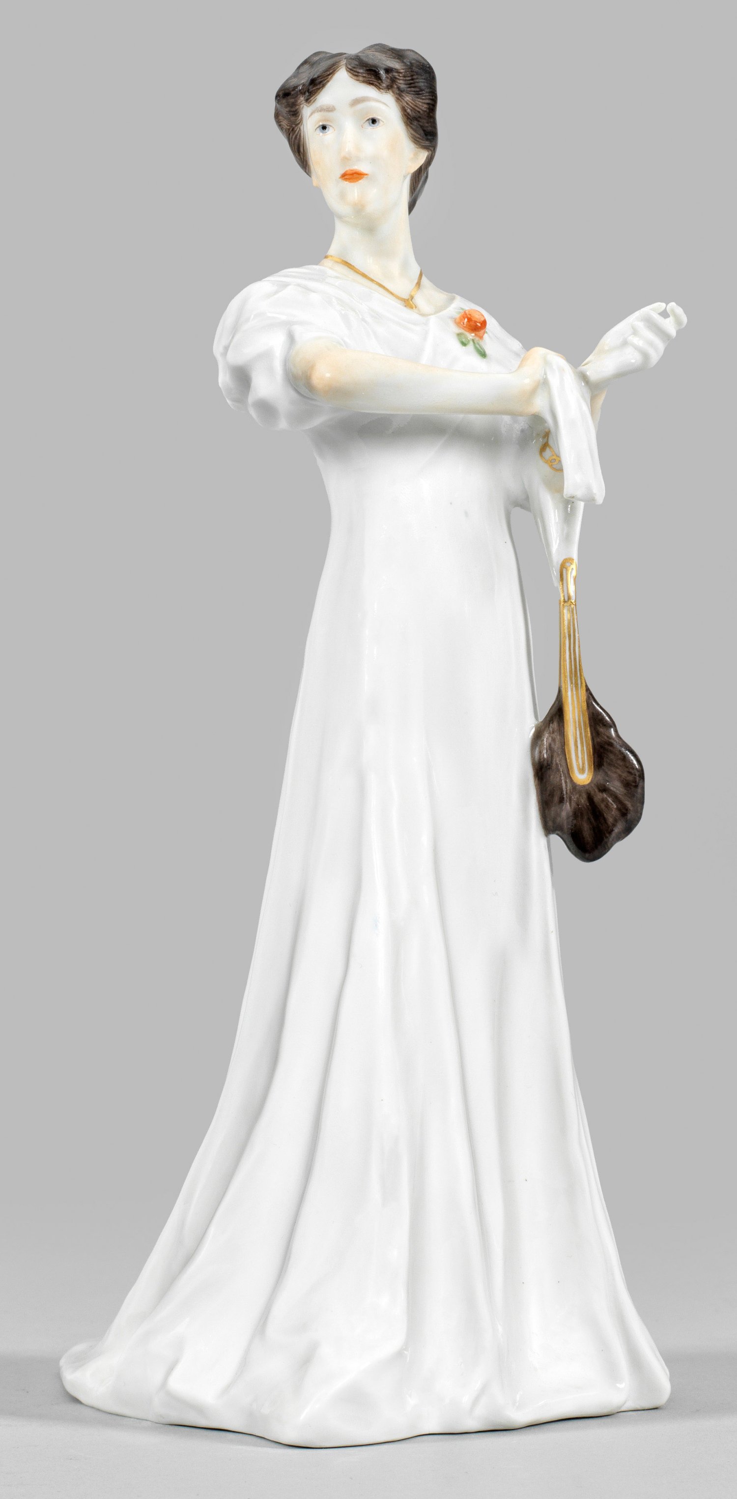 Elegant gekleidete Dame in langem, weißem Ballkleid mit Schleppe, feiner Goldkette und roter Ansteckrose, sich den linken Handschuh anziehend. Den Rechten hält sie in der Hand. An ihrem linken Arm hängt eine schwarzes Abendtäschchen. Polychrome Malerei mit etwas Gold. Entw. Rudolf Hentschel, 1909/1910. Modell-Nr. A 205. Schwertermarke. H. 25,5 cm.