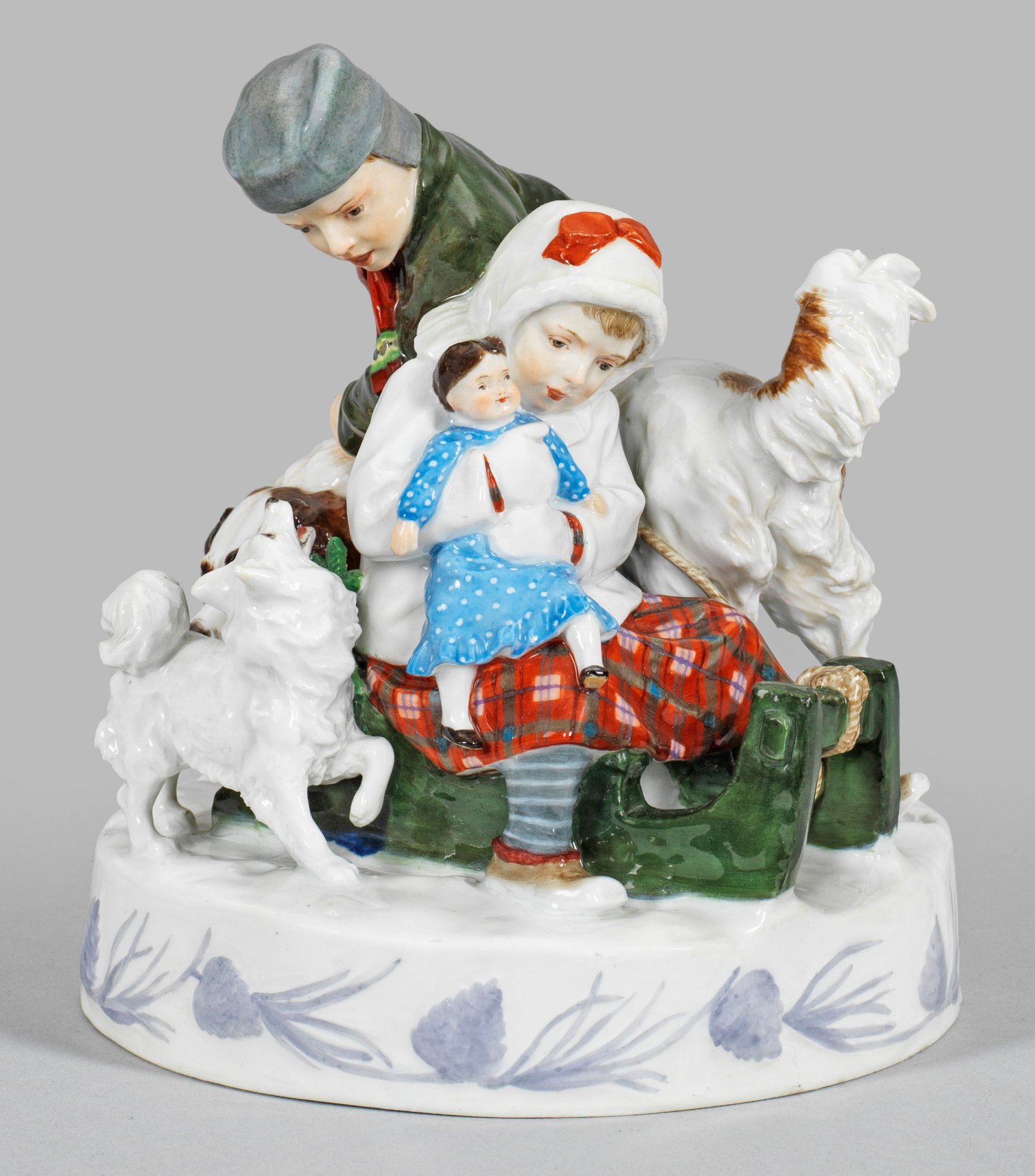 Runder Sockel mit Reliefbordüre aus Kiefernzapfen und -nadeln. Vollplastische Darstellung einer Kindergruppe in winterlicher Kleidung, umgeben von einem Bernhardiner und einem deutschen Spitz. Auf einem grünen Schlitten sitzendes kleines Mädchen mit Puppe. Hinter ihr ein herannahender Junge mit einem Schneeball. Polychrome Malerei. Entw. Erich Hösel, um 1905 - 1910. Modell-Nr. V 109. Minim. best./rest.; Schwertermarke. H. 15,5 cm. D. 14 cm.