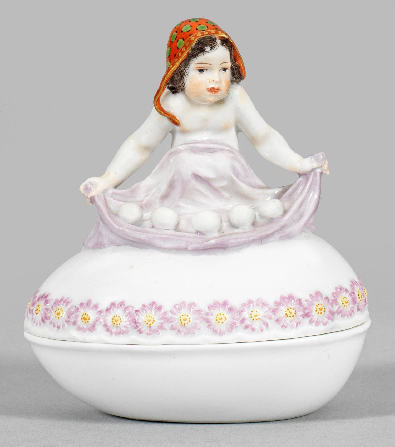 Eiförmiger Korpus mit umlaufender Blütenreliefbordüre. Als Deckelbekrönung ein sitzendes, kleines Mädchen mit roter, grün gepunkteter Kappe, in einem fliederfarbenem Tuch fünf Ostereier tragend. Polychrome Malerei mit etwas Gold. Entw. Paul Helmig, um 1905 - 1910. Modell-Nr. Y 126. Minim. best.; Schwertermarke. H. 11 cm. L. 9 cm.