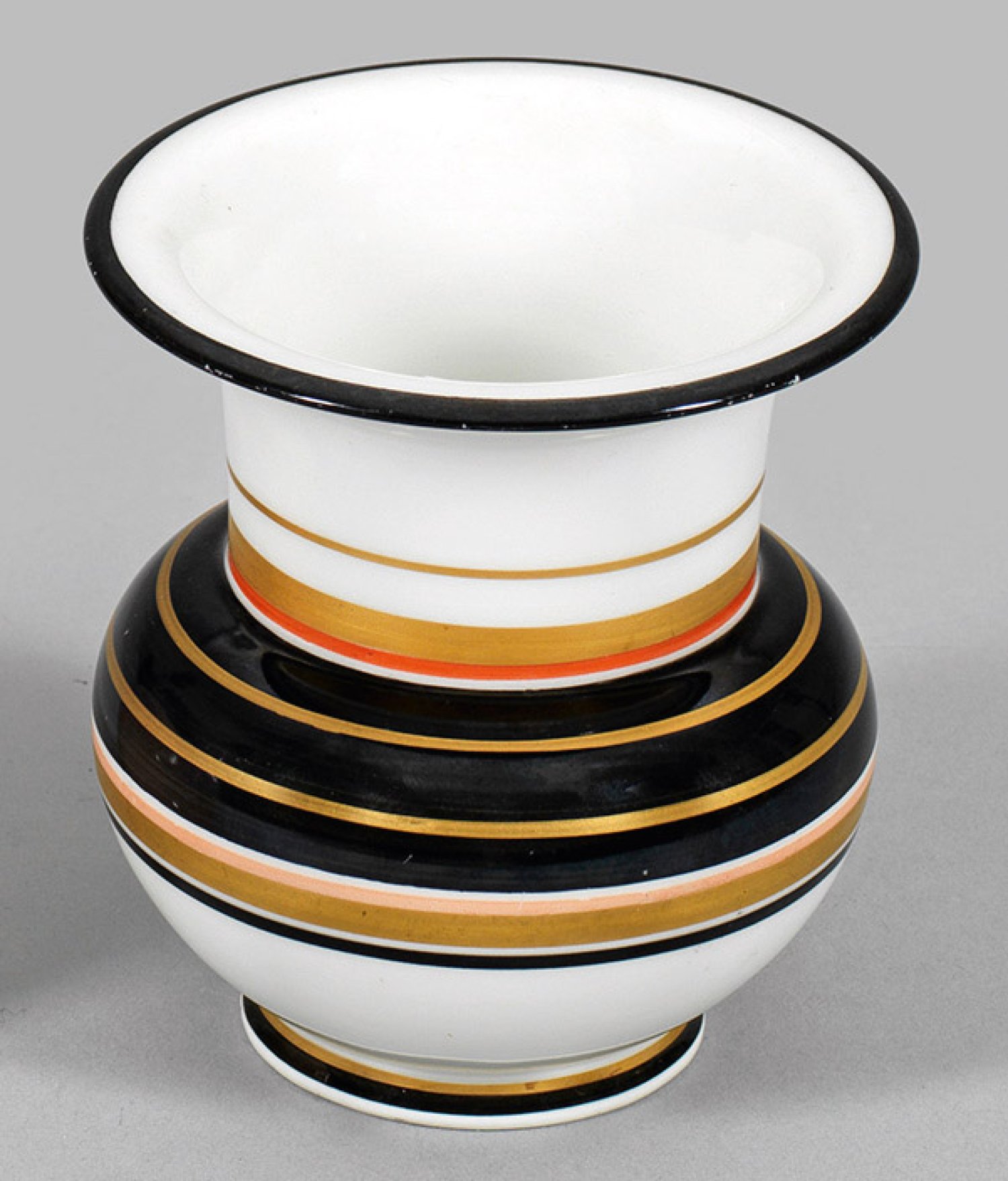 mit Dekor 25/13, kleinste Modellausformung, Ringe in Schwarz-Rot-Gold in Aufglasurmalerei. Dekor-Entw. Ernst Böhm, um 1928. Zepter- und Malereimarke. H. 9 cm.