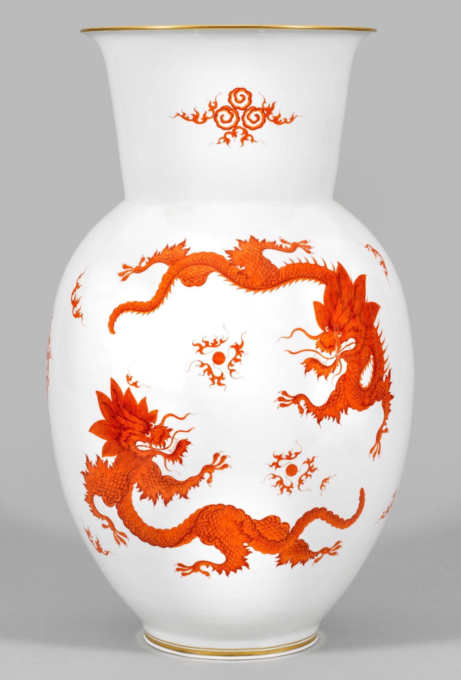 Ovoider Korpus mit gerundeter Schulter, in abgesetzten, sich konisch erweiternden Hals und ausschwingenden Mündungsrand übergehend. Beidseitig der Wandung, großflächig angelegte Darstellung von zwei, eine geflammte Perle umringenden, vierklauigen Drachen nach ostasiatischem Vorbild umgeben von stilisierten Wolken- und Flammenmotiven. Eisenrote Camaieumalerei mit Goldrand. Form-Entw. Paul Börner, 1927. Modell-Nr. L 202. Schwertermarke. H. 65 cm.
