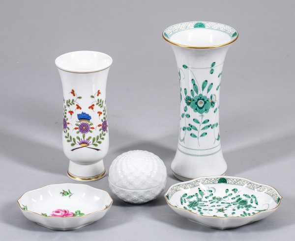5-tlg.; 2 Vasen, 2 Konfektschälchen und eine Bonbonniere. Teilw. Blütenrelief. Kupfergrüner Indisch- bzw. "Alter chinesische Blumen"-Dekor mit Schmetterling sowie Rosendekor. Polychrome, teilw. Camaieumalerei mit Goldrand. Schwertermarke. Vasen-H. 21 cm - 25,5 cm.