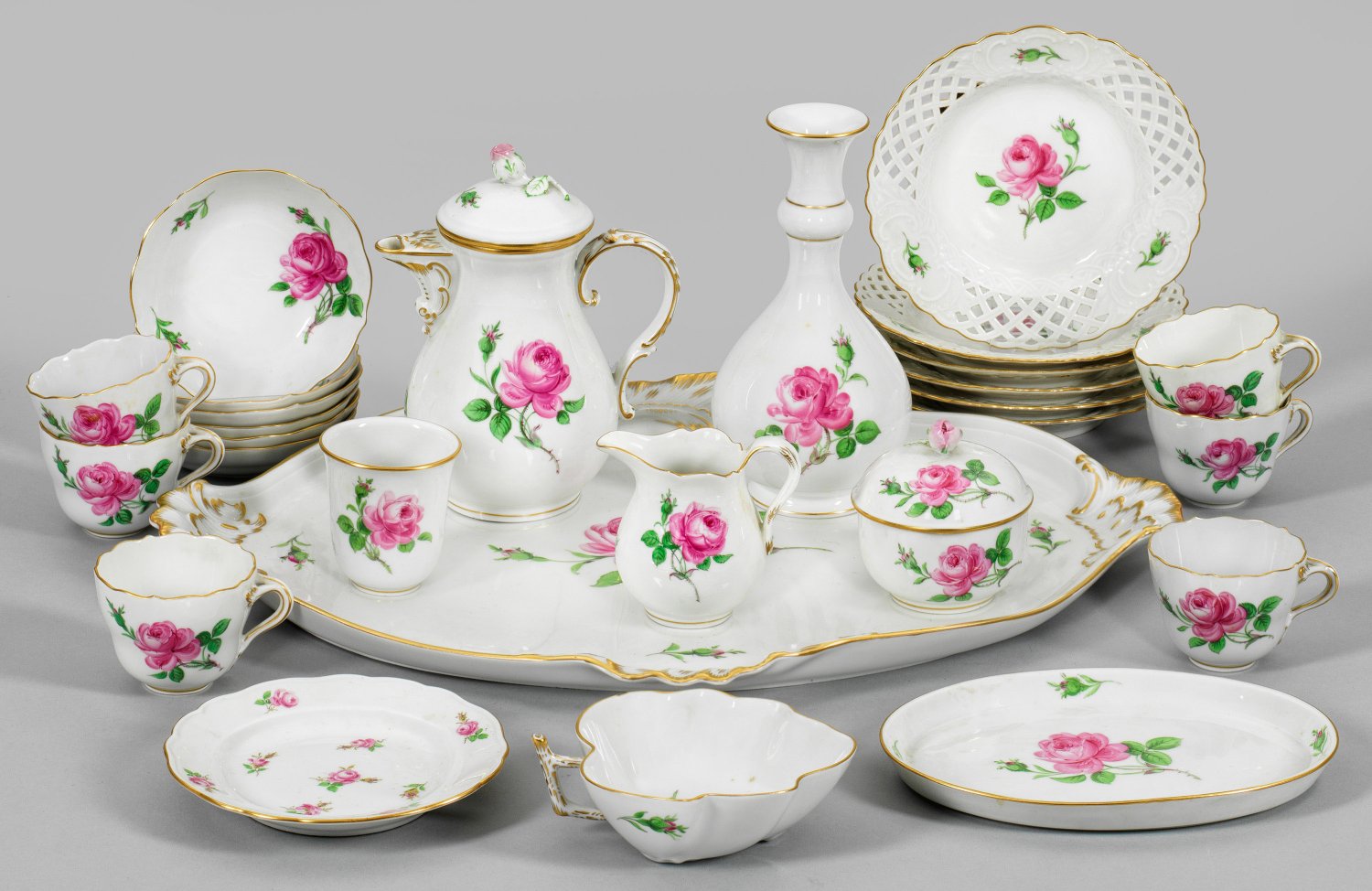 20-tlg.; Mokkakanne, Sahnegießer, Zuckerdose, 6 Mokkatassen mit Untertassen, 6 Kuchenteller, Vase, Becher, Blattschälchen, 2 Tabletts. Teilw. durchbrochen gearbeitet. Feiner Rosendekor in polychromer Malerei. Goldstaffage. Beigabe: Konfektteller mit Streurosendekor. Schwertermarke. Kannen-H. 16,5 cm. Tablett-L. 45 cm. Teller-D. 15,5 cm.