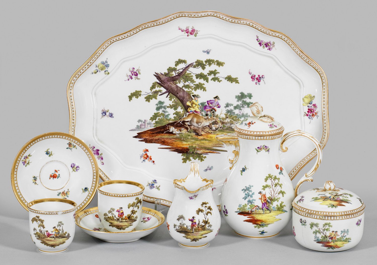 für 2 Personen. 6-tlg.; Kaffeekanne, Zuckerdose, Sahnegießer, 2 Kaffeetassen mit Untertassen, Tablett. Auf der Wandung und im Spiegel szenische Darstellungen von Jägern in Begleitung ihrer Hunde, teilw. bei der Hetzjagd, zu Fuß oder zu Pferd, umgeben von gestreuten Blüten. Äußerst feine polychrome Malerei nach Kupferstichen von Johann Elias Ridinger. Goldornamentbordüre, sog. Galeriekante. Schwertermarke. Teilw. best./rest. Tablett 41 cm. x 32 cm.