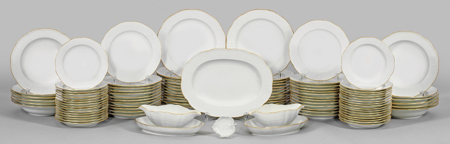 102-tlg.; 25 Vorspeisen-, 24 Speise-, 18 Suppen-, 33 Brotteller, Sauciere, Anbietplatte. Reliefdekor "Altozier" mit Goldrand. Teilw. best./ber.; Zepter- und grüne Malereimarke. Plattenmaße 31,5 cm x 23,5 cm. Beigabe: kleines, blattförmiges Salzschälchen.