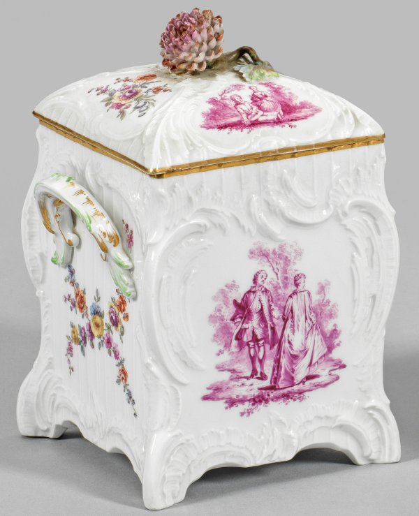 (bzw. Knasterkasten). Zylinderförmiger Korpus auf gebogten Rocaillefüßen, seitlich blattreliefierte Henkel. Gewölbter Deckel mit plastischem Blütenknauf. "Reliefzierrat"-Dekor. Auf der Wandung und dem Deckel kartuschengerahmte Watteauszenen im Wechsel mit feinen Blumengebinden in purpurfarbener Camaieu- bzw. polychromer Malerei. Goldstaffage. Unw. rest.; Zepter- und Malereimarke. H. 18,5 cm.