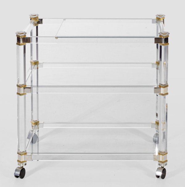 Acrylglas, Messing und farbloses Glas. Gestell aus schräggestellten, gekanteten Streben und Stegen auf Rollen als Träger für rechteckige Ablageflächen, teilw. mit Aussparung für Flaschen. H. 70,5 cm. 73 cm x 46 cm.