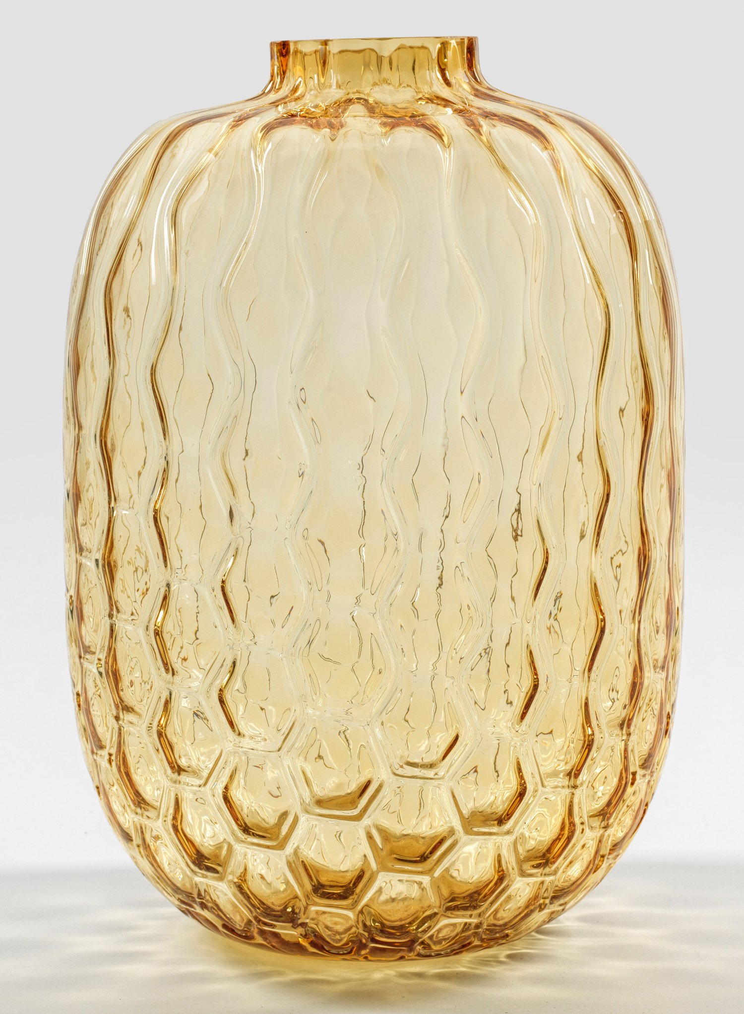 Walzenform, zum Stand und zur Schulter gerundet, kurzer, leicht verengter Hals. Hellbernsteingelbes bzw. topasfarbenes Glas, reliefiert in ein Modell mit Sechseckwaben und vertikalen Wellen geblasen. H. 50 cm.
