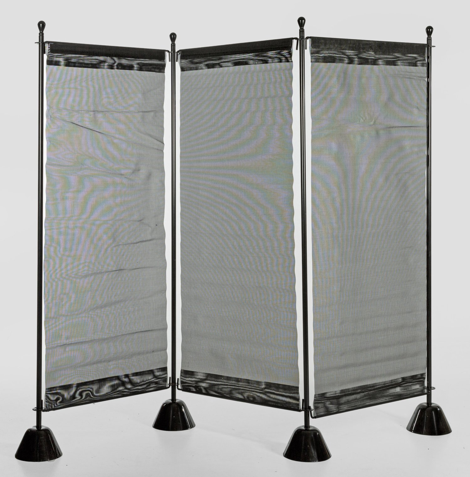 3-tlg.; Metall, schwarz lackiert und schwarzes Netz. Variabel aufstellbares Gestell aus schlanken Rundstäben mit Knaufbekrönung auf kegelförmigen Basen. Einhängbare Bespannung. Bez. "Zanotta made in Italy" sowie Hängeetikett mit Entwerferangaben. Entw. Achille Castiglioni, 1986. Pro Paneel: 178 cm x 74 cm.