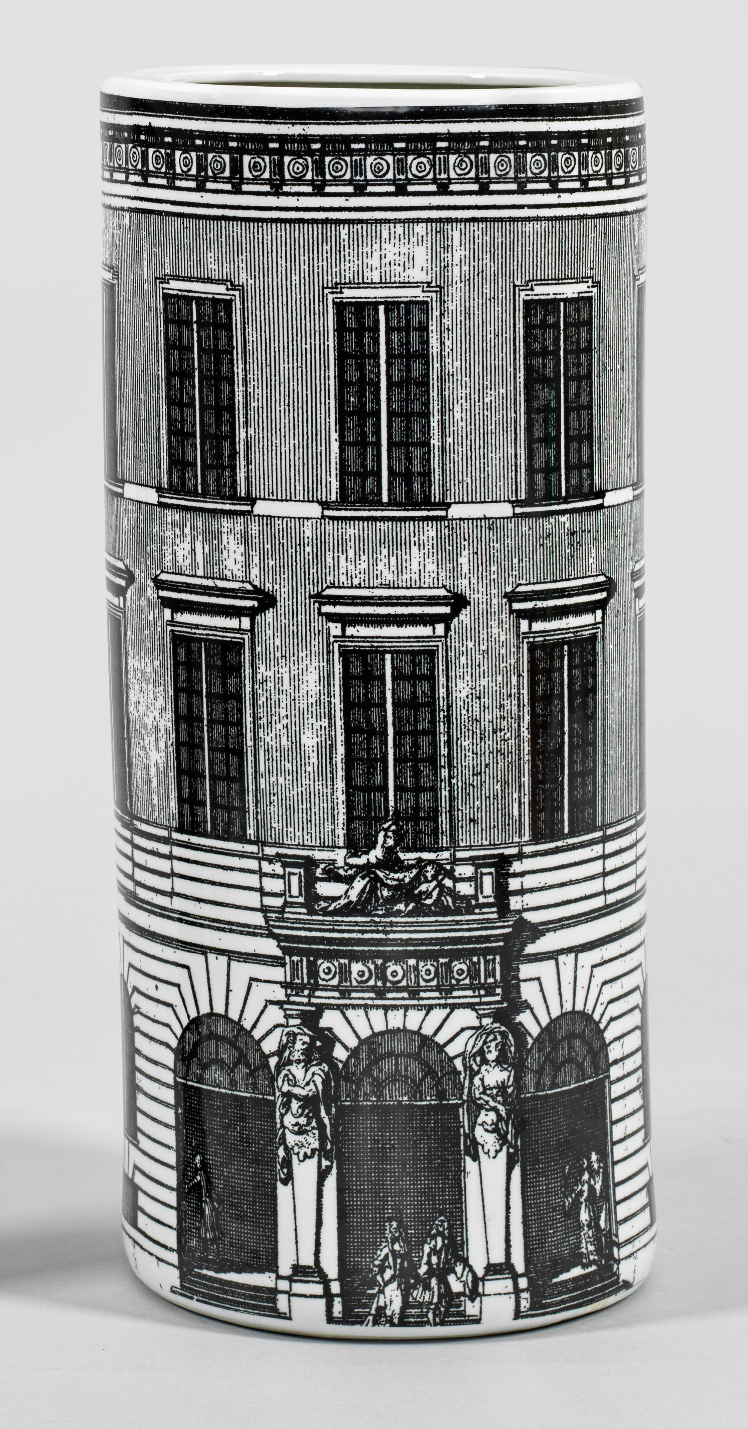 Zylinderförmiger Korpus, umlaufender Dekor nach Fornasetti, Italien. Schwarzer Umdruck. H. 46 cm.