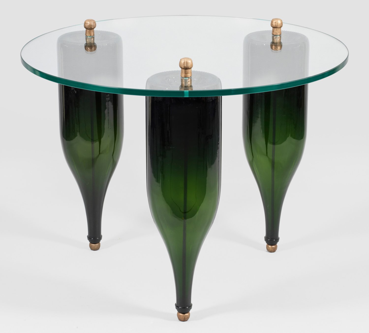 Grünes und farbloses Glas sowie Bronze. Drei Magnum-Champagnerflaschen mit Bronzekorken als Träger für runde Deckplatte. Oberhalb Zierbaluster aus entsprechenden Korkenmotiven. H. 75 cm. D. 100 cm.