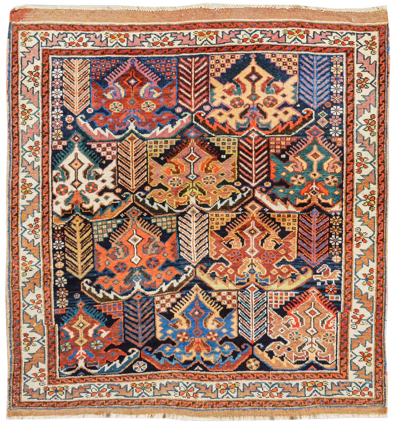 Persien. Mitte 20. Jh.; Wolle auf Baumwolle. Auf dunklem Fond flächendeckend dichte Musterung aus großen Kartuschen- und Blattmotiven. Umlaufend schmale, elfenbeinfarbene Bordüre aus Zackenblättern. 101 cm x 108 cm.