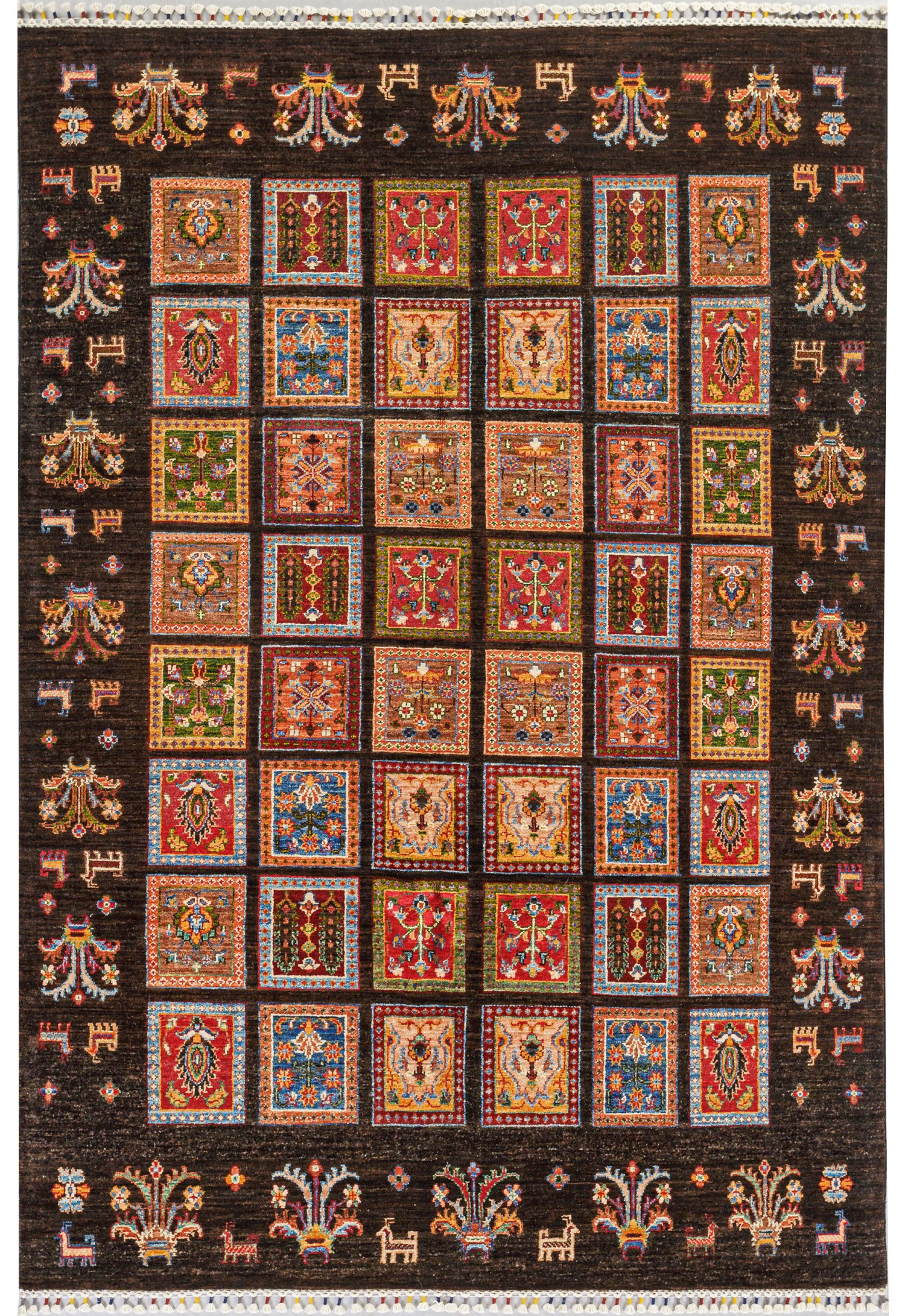 Afghanistan. Wolle auf Baumwolle. Auf schwarz-braunem, abraschiertem Fond flächendeckende Musterung aus unterschiedlich gestalteten Feldern mit Blütenrispen. Offen gestaltete Bordüre aus Blütenarrangements und stilisierten Wildtieren. 232 cm x 165 cm.