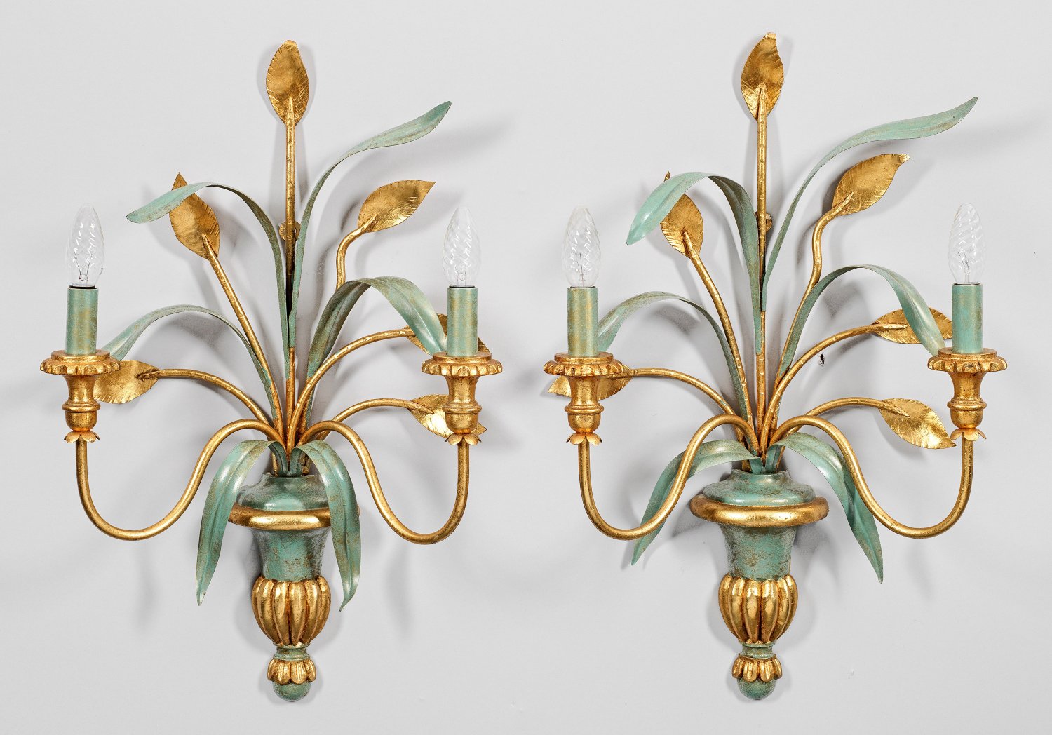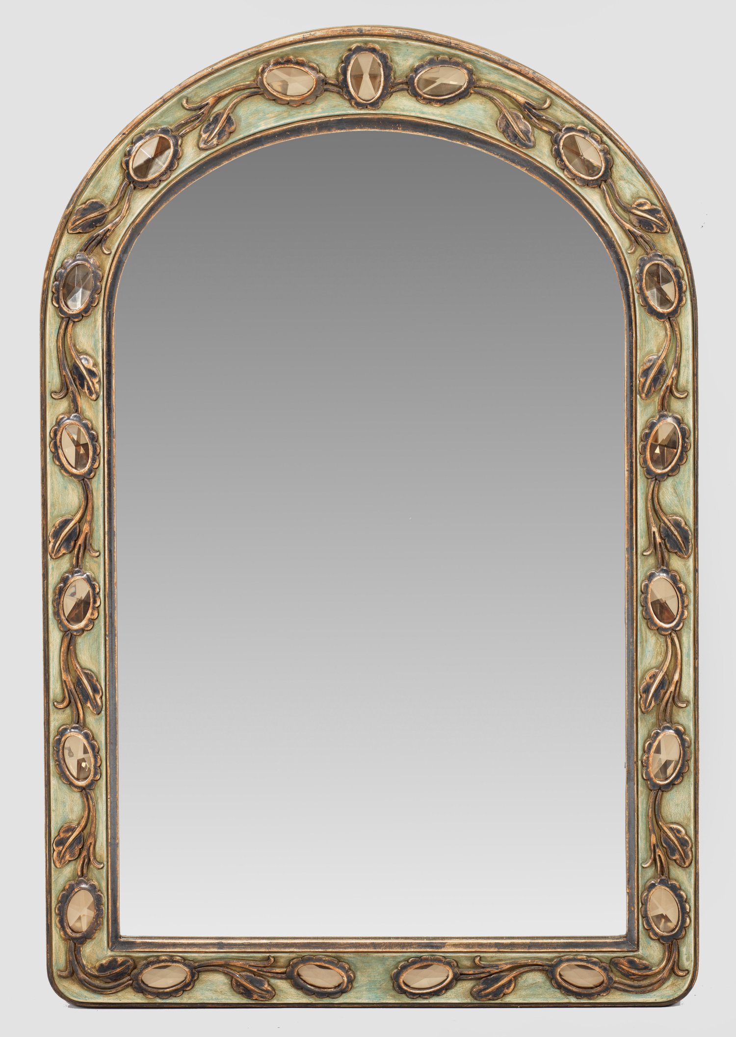 Holz, stuckiert mit prismenartig geschliffenen Glaseinsätzen bzw. Holz und Metall, seegrün gefasst und teilw. vergoldet. Hochrechteckige, leicht gekehlte Spiegelrahmung mit gewölbtem oberen Abschluss sowie breitem Fries aus stilisierten Blütenranken. Facettiertes Spiegelglas; Balusterförmiges Wandschild und stilisiertes Blattwerk als Träger für geschwungene Leuchterarme. Elektrifiziert. Spiegel: 120 cm x 78 cm. Leuchter-H. 63 cm.