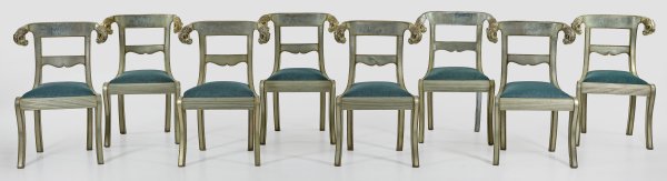 Holzkorpus, flächendeckend belegt mit silberfarbenem Metall und schmalen Ornamentbändern. Trapezförmige, teilw. godronierte Zarge auf ausgestellten Beinen, in zurückschwingende Rückenlehnenrahmung übergehend. Gewölbter oberer Abschluss mit vollplastisch gestalteten Widderköpfen. Sitzfläche gepolstert und bezogen. Sitz-H. 47 cm.