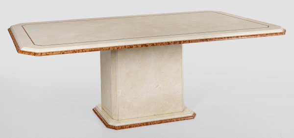 Cremefarbener bzw. in unterschiedlichen Rosétönen gemaserter sog. Rosa Tea-Marmor. Über flacher, rechteckiger und umlaufend profilierter Plinthe mit abgeschrägten Ecken gekanteter Sockel als Träger für weit überstehende, korrespondierende Deckplatte mit eingelegter Bandeinlage. H. 76 cm. 220 cm x 105 cm.