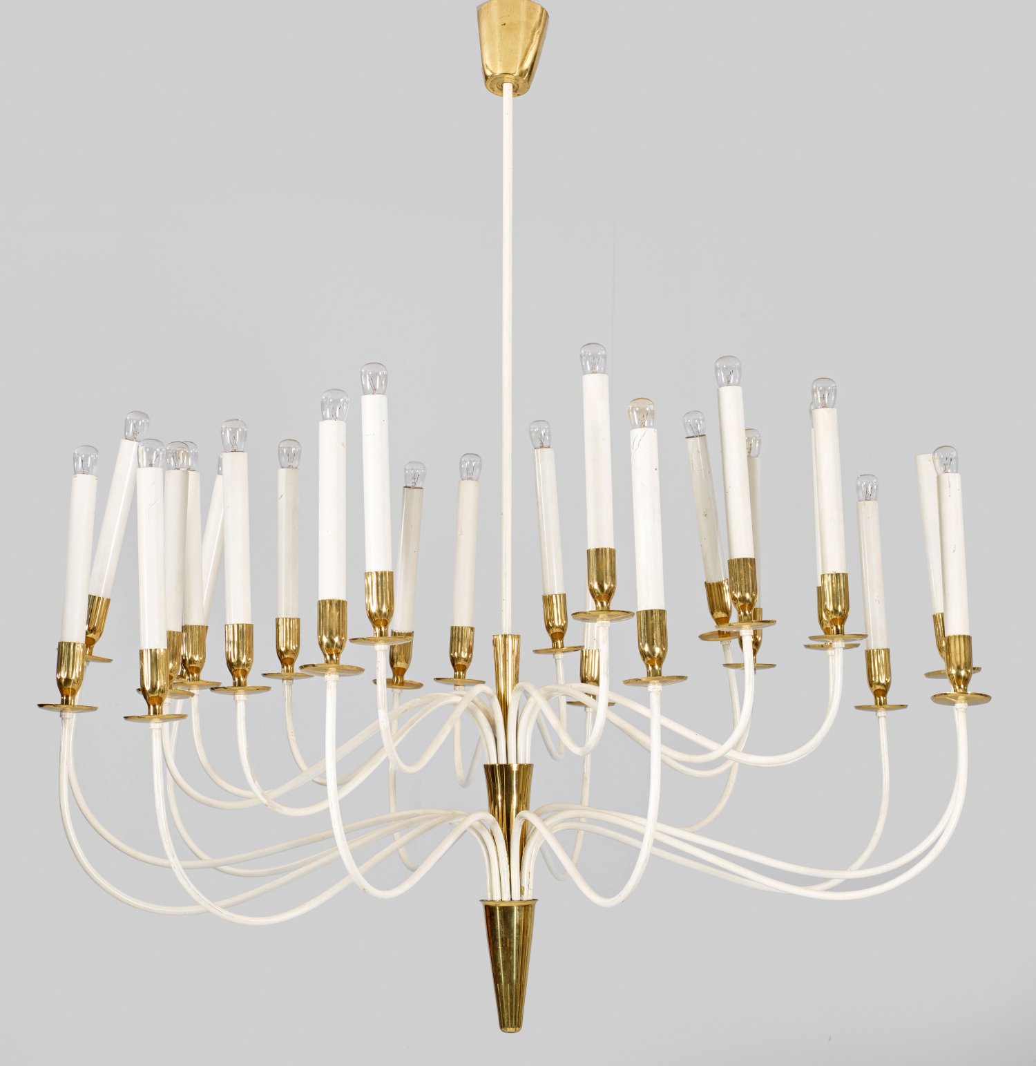24-flg.; Messing und weiß lackiertes Metall. Schlanker, gegliederter Korpus, davon ausgehend schlanke, weit ausladende, stark geschwungene und gestuft angeordnete Leuchterarme als Träger für Leuchtmittel mit zylinderförmigen Tüllen. Oberhalb schlanker Rundschaft. Elektrifiziert. H. 105 cm. D. 97 cm.