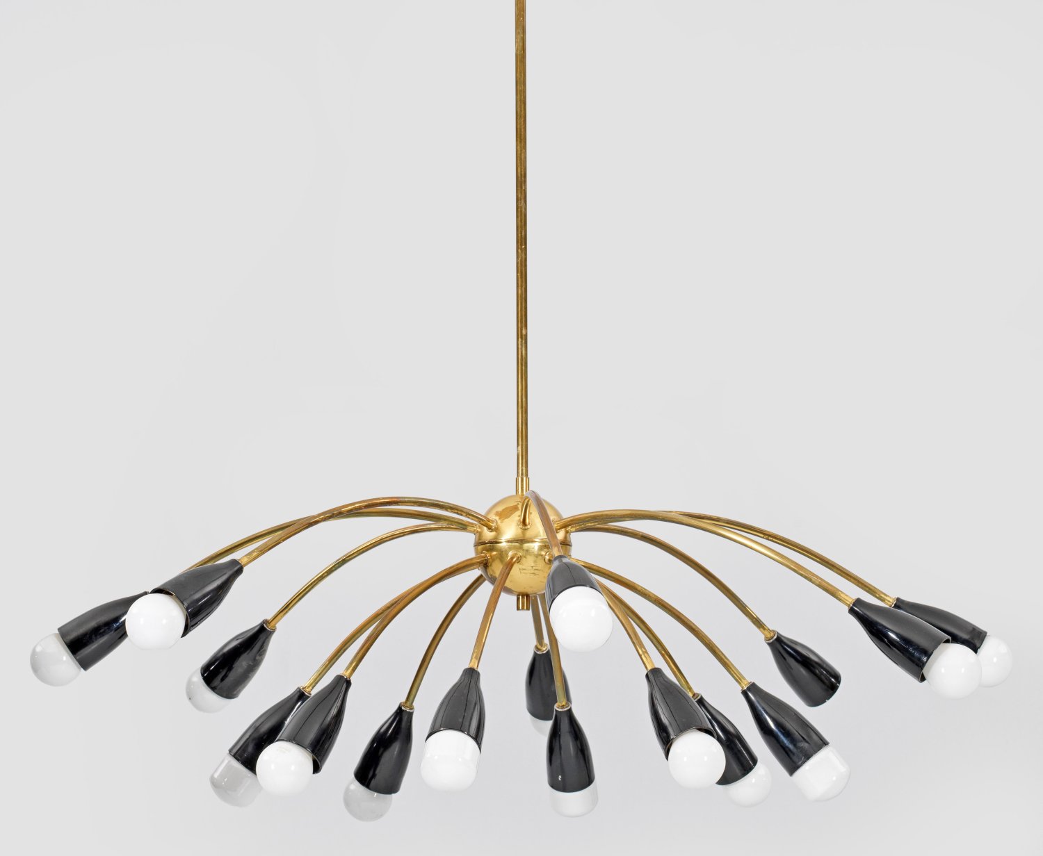 16-flg.; Messing und schwarz lackiertes Metall. An langem, schlanken Rundschaft Kugelelement als Träger für entsprechende, gebogte und gestuft angeordnete Leuchterarme mit kelchförmigen Tüllen für Leuchtmittel. Elektrifiziert. H. 130 cm. D. 82 cm.