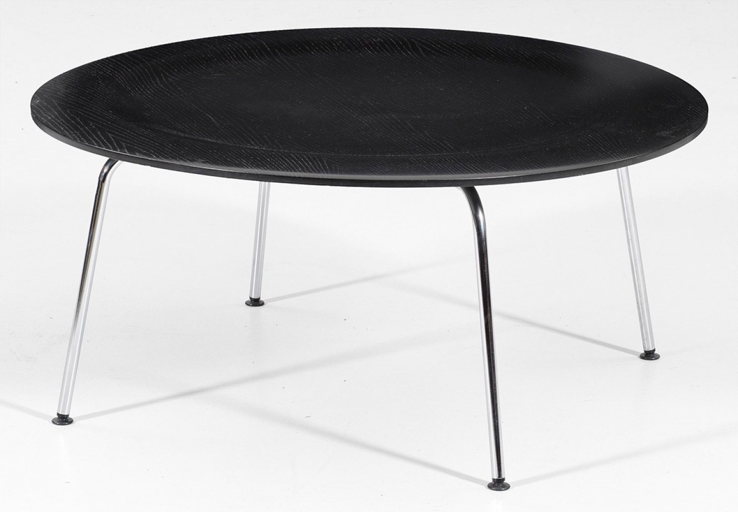 Metall, verchromt und schwarz lackiertes Schichtholz. Gestell aus schräggestellten Rundstäben als Träger für runde, mittig gemuldete Deckplatte. Herstellerzeichen. Entw. Charles & Ray Eames 1945/46. H. 39,5 cm. D. 86 cm.