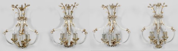 2-flg.; Farbloses Kristallglas und Metall versilbert. Balusterförmiger, offen gestalteter Korpus aus gebogten Streben sowie Wandschild in Form eines schlanken Balusterschafts als Träger für Leuchtmittel mit blütenförmiger Traufschale. Gestreckte Bekrönung aus Blütenzweigen. Elektrifiziert. H. 37 cm.