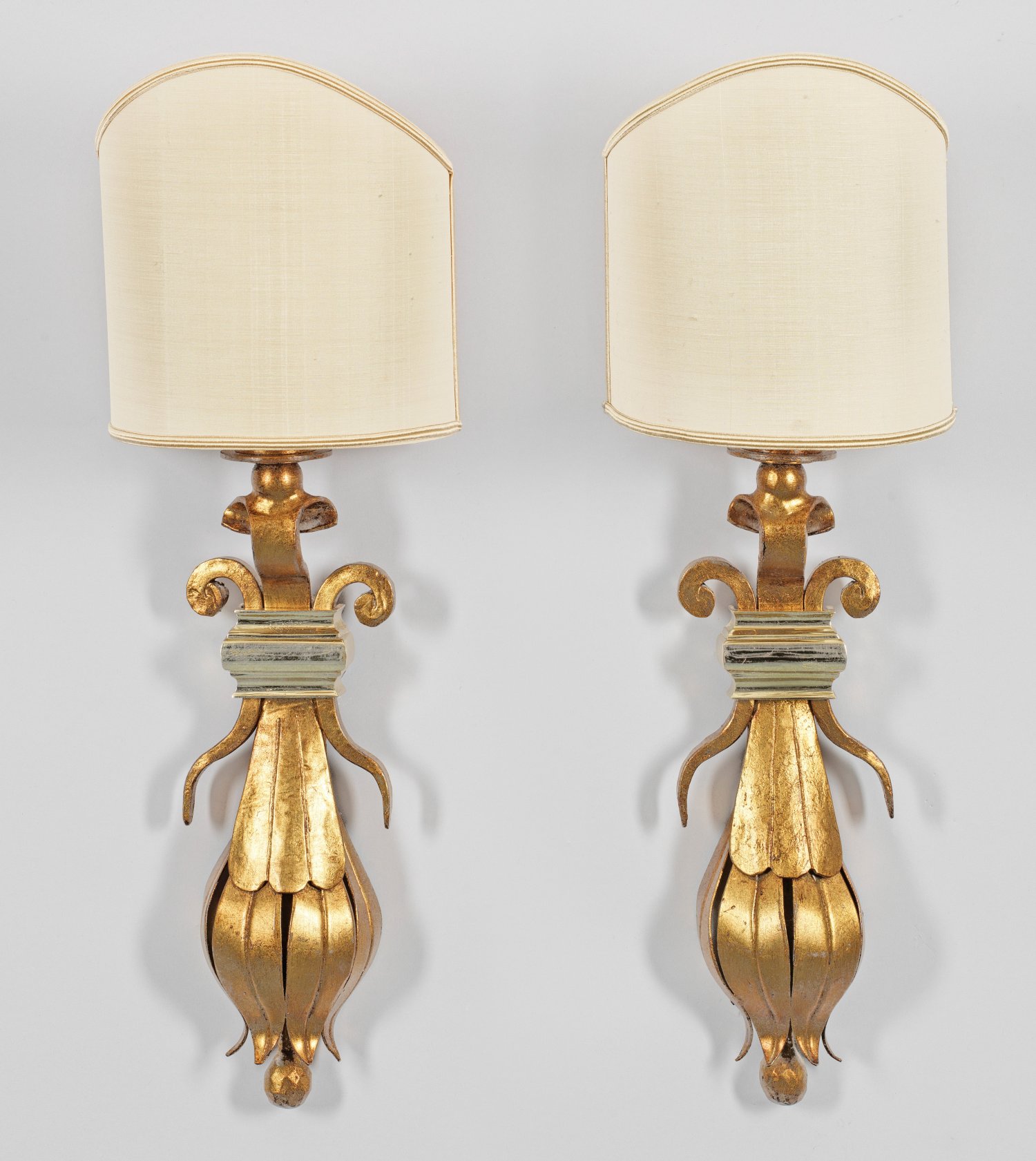 A pair of decorative German gilt golden lacquered metal wall lamps.