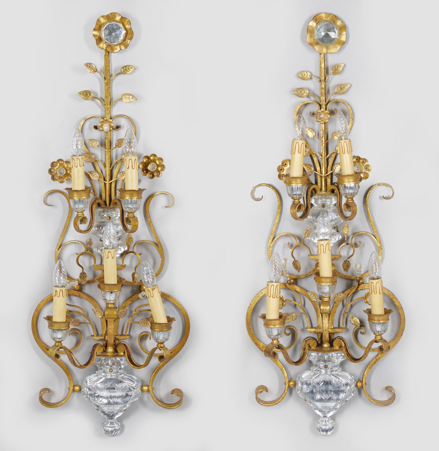 A pair of French large gilt metal and glass sconces by Maison Baguès.