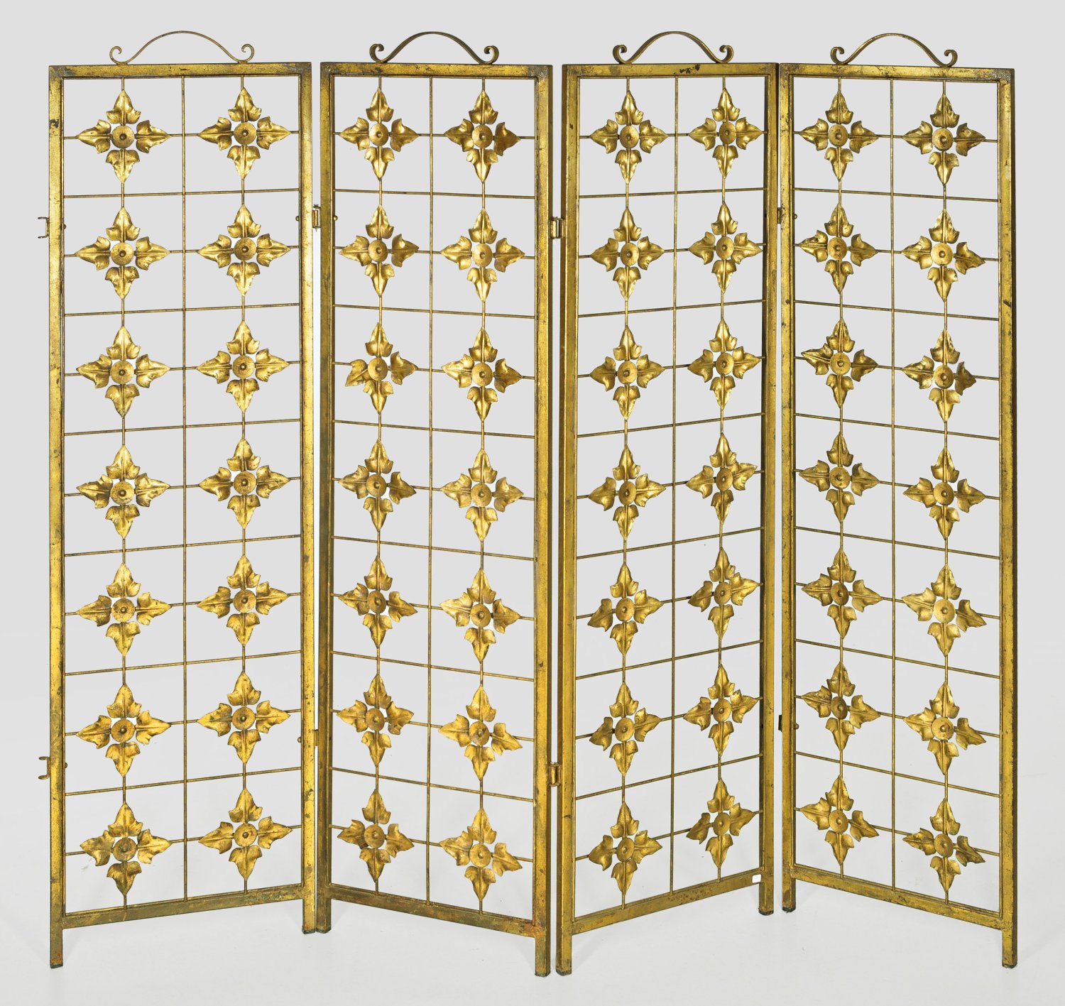 4-tlg.; Metall, vergoldet. Schlanke, hochrechteckige, offen gestaltete Paneele aus schlanken, gekanteten Streben und Stegen sowie gitterartig angelegten Rundstäben und applizierten Blattreserven in Form von stilisierten Poinsettiablüten im Rapport. Volutenartige Bekrönung. Pro Paneel: 156,5 cm x 44,5 cm.