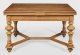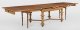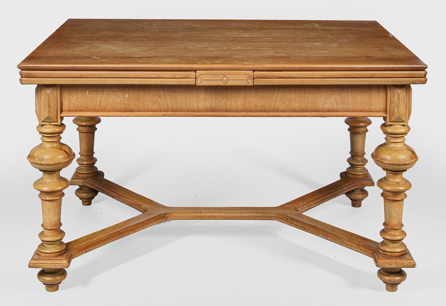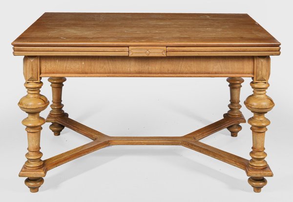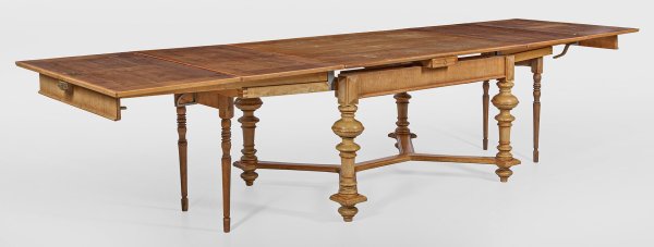 Helles Nussbaum, furniert. Gerade, profilierte Zarge mit gesteinelten Ecken auf mehrfach gegliederten Balusterbeinen, unterhalb durch breite Stege verbunden. Mehrfach ausziehbare Deckplatte. Herstellerzeichen "Richard Saalfeld Patent Automatentisch". H. 76 cm. 99 cm x 130/350 cm.