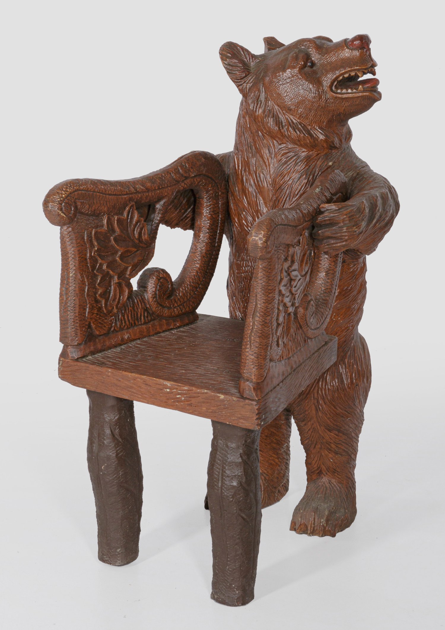 Holz, vollplastisch geschnitzt und rotbraun gefasst. Skulpturale, leicht idealisierende Darstellung eines stehenden Bärenjungen als Stütze für trapezförmige Sitzfläche auf astartigen Beinen. Durchbrochen gearbeitete, blattreliefierte Armlehnen. H. 92 cm. Sitz-H. 38,5 cm.
