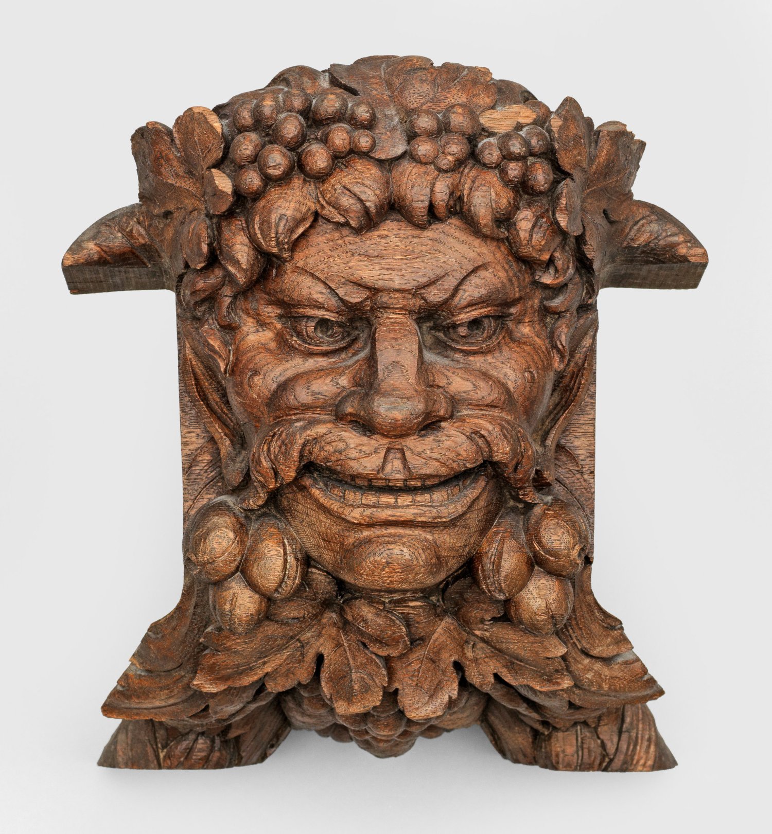 Eichenholz, reliefplastisch geschnitzt. Ausdrucksstark geschnitzter Bacchus-Kopf mit üppigem Blattwerk und Trauben aus einem Schrank oder Vertäfelungsgesims. H. 29 cm.