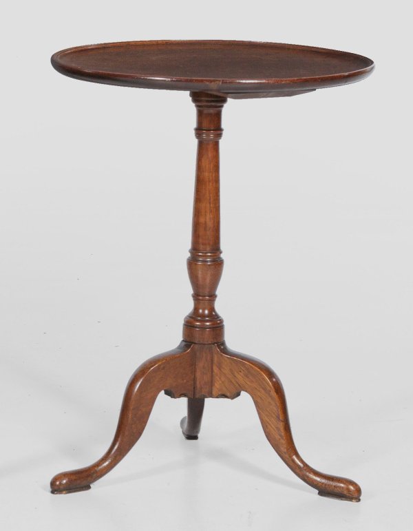 Mahagoni, massiv. Mehrfach gegliederter Balusterschaft auf stark geschwungenen Beinen als Träger für runde Deckplatte mit flach erhöhter Profilrahmung. H. 67 cm. D. 49 cm.