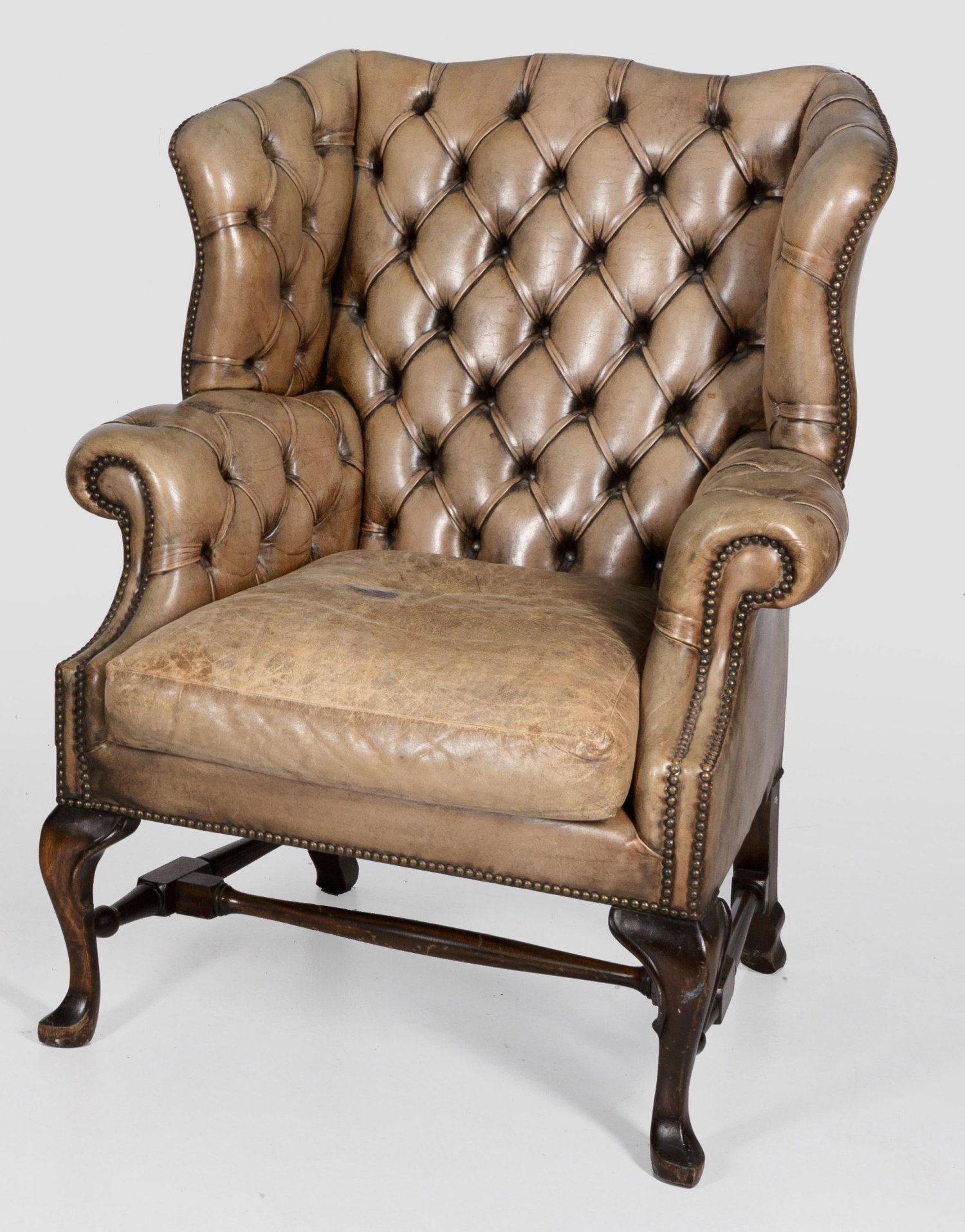 Mahagoni und grau-braunes Leder. Trapezförmige Zarge auf geschwungenen Beinen, durch Balusterstäbe verbunden. Gerundete Armlehnen sowie hohe Rückenlehnenrahmung mit breiten Ohrenbacken und tiefer Knopfpolsterung. H. 111 cm. 89 cm x 75 cm. Sitz-H. 47 cm.