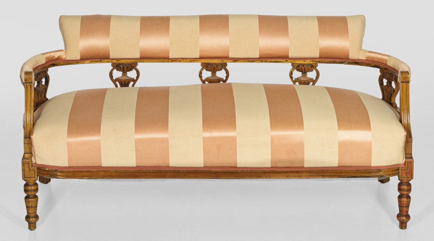 Nussbaum. Schmale, profilierte Zarge auf Balusterfüßen. Durchbrochen gearbeitete, vasenartige Stützen für schmale, gebogte Armlehnen und flache Rückenlehnenrahmung mit gewölbtem Abschluss. Gepolstert und bezogen. H. 66 cm. 144 cm x 63 cm. Sitz-H. 40 cm.
