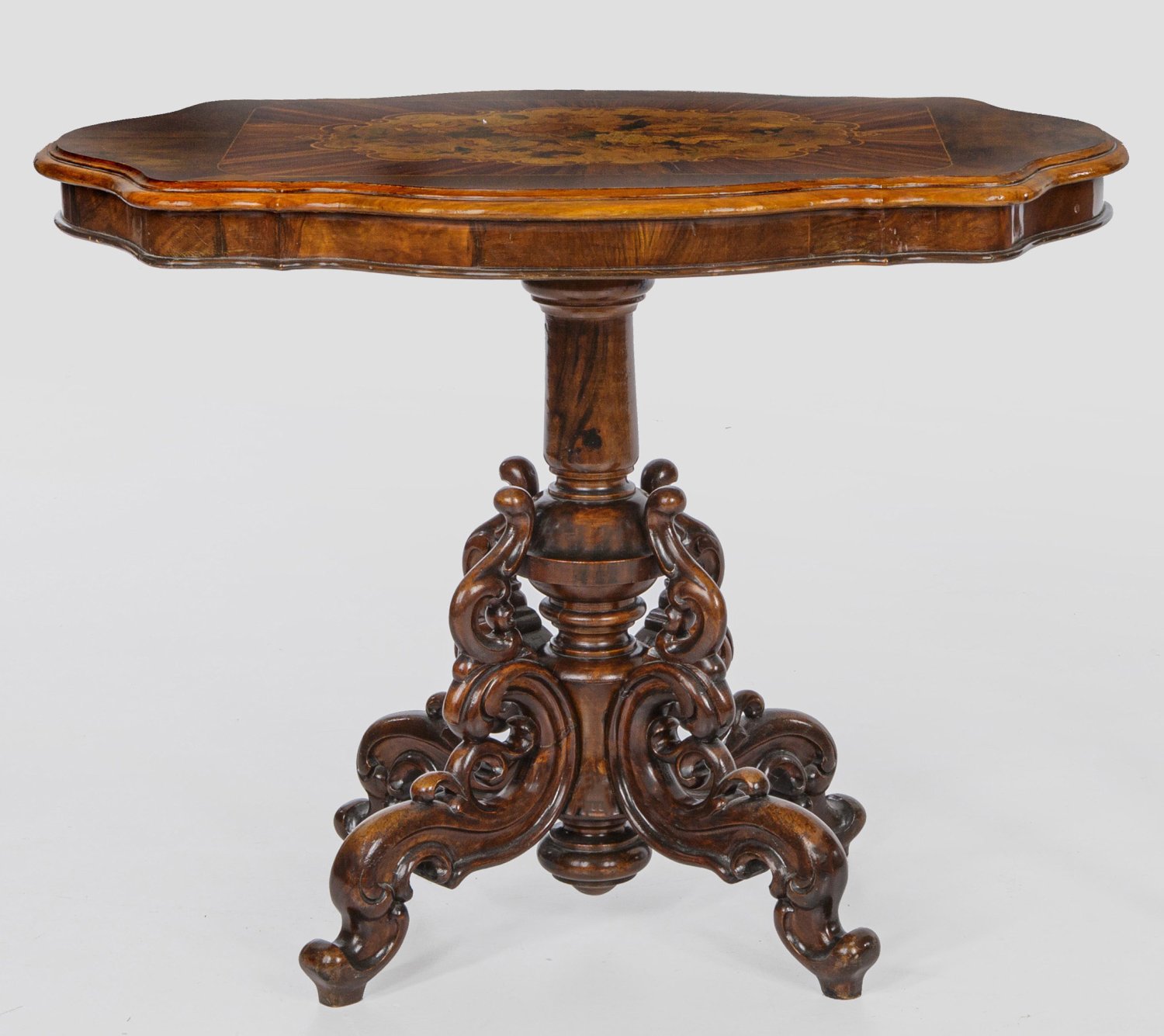 Nussbaum, massiv und furniert sowie Einlagen aus unterschiedlichen, teilw. gefärbten Edelhölzern. Mehrfach gegliederter Balusterschaft auf durchbrochen gearbeiteten Volutenbeinen als Träger für passig geschweifte Zarge und gering überstehende, profilierte Deckplatte mit großflächiger Blütenintarsie. H. 77 cm. 99 cm x 63 cm.