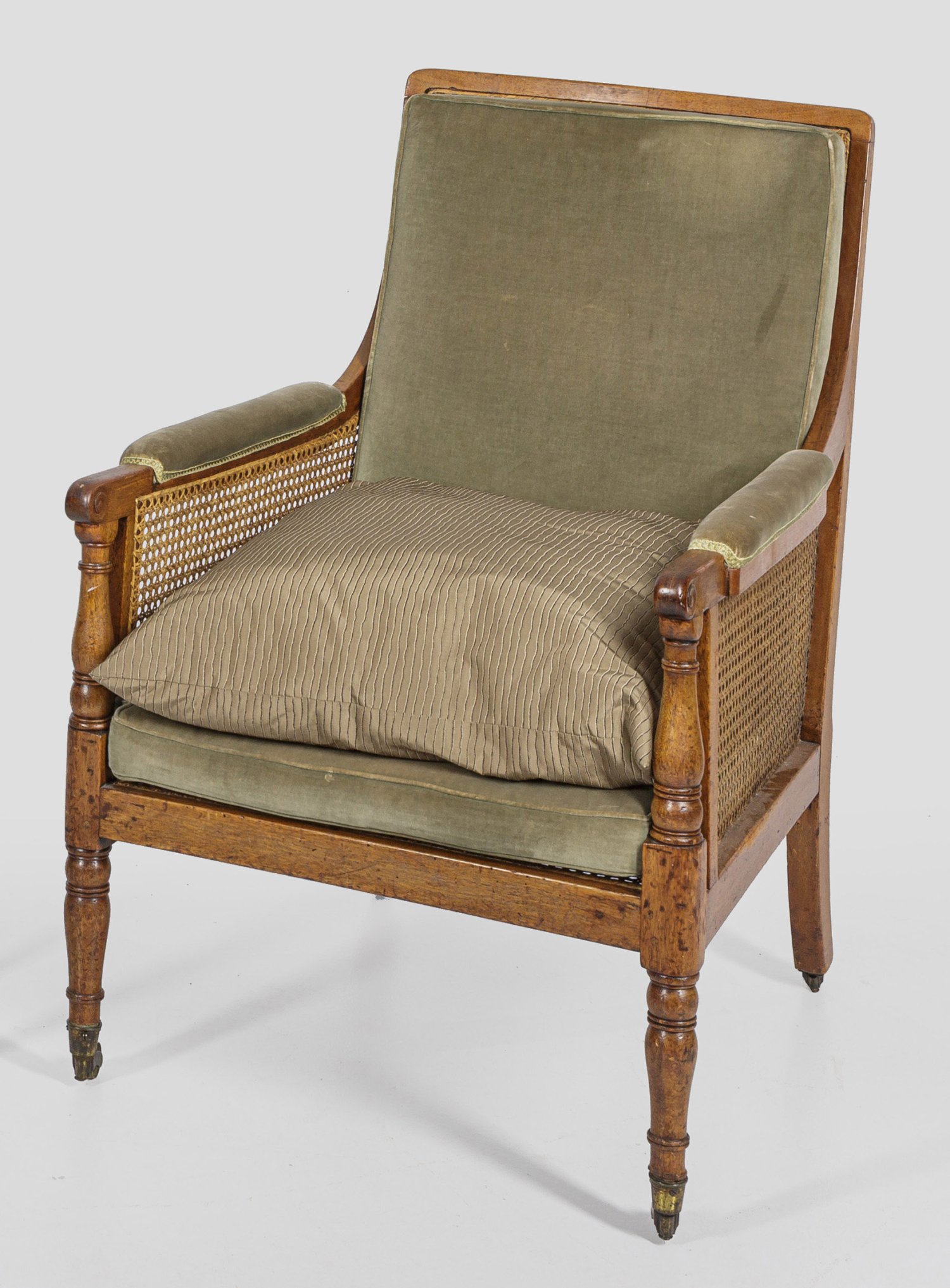 Mahagoni. Trapezförmige Zarge auf schlanken Balusterbeinen mit Rollen. Korrespondierende Stützen für schmale Armlehnen sowie hochrechteckige, leicht gewölbte Rückenlehnenrahmung. Flächendeckende Bespannung aus Rohrgeflecht sowie lose Polsterauflagen. H. 95 cm. 64 cm x 71 cm. Sitz-H. 37 cm.