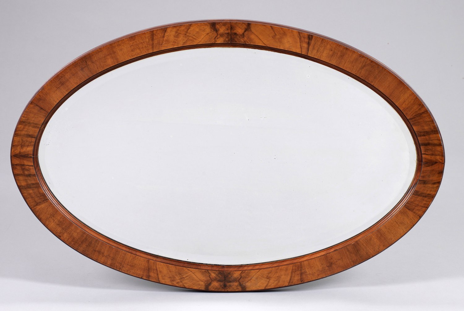 Nussbaum, furniert. Schmale, ovale Spiegelrahmung für facettiertes Spiegelglas. 76 cm x 49 cm.
